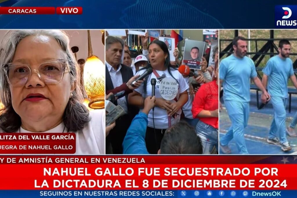 ¿Ustedes piensan que en estos días Nahuel Gallo puede salir en libertad?, consultó la periodista Dayana Bermúdez en la señal latinoamericana de noticias DNEWS. “Estoy segura, estoy completamente segura, Nahuel va a salir. Yo le digo a mi hija para darle ánimo, en las próximas horas, mi amor, ya en las próximas horas… nosotros pensamos así. A Nahuel no lo pueden dejar de último, Nahuel va a salir ahora, en este momento”.