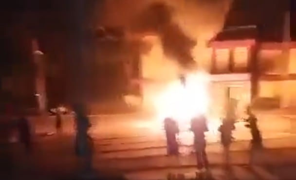 Un grupo de gente entró a la fuerza una sede del partido gobernante y quemaron muebles y material de propaganda en una gran hoguera