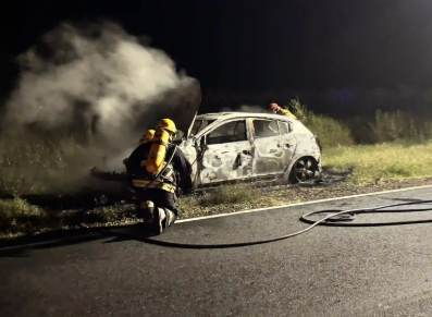 FALUCHO | Una joven que viajaba desde la ciudad de General Pico hacia San Rafael, Mendoza, sufrió un inesperado contratiempo cuando su Renault Megane se incendió por completo cerca de Falucho. Afortunadamente, resultó ilesa.