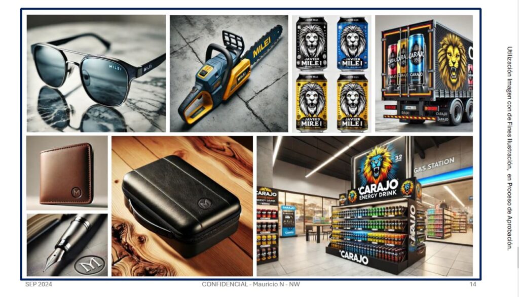 Ambos “brochures” incluían, además, un esquema de licencia o “fee” que derivaría fondos hacia estructuras políticas, educativas o afines, con distribución internacional en Miami, Nueva York y Europa. Y hasta trazaba la posibilidad de expandirse a otros productos como anteojos de sol, motosierras con la marca “Milei” grabada, billeteras, lapiceras y maletines con el apellido “Milei” o la letra “M”, y hasta bebidas energizantes “CARAJO Energy Drink”, con mockups que las mostraban distribuidas en góndolas de estaciones de servicio.