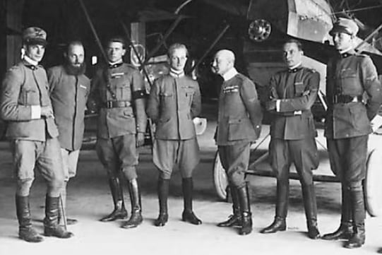 Esa mañana, poco antes de las seis, once Ansaldo S.V.A. despegaron de San Pelagio rumbo a Viena. Eran aviones rápidos y ligeros, adaptados para una travesía excepcional; uno de ellos, un biplaza modificado, llevaba a Gabriele D’Annunzio junto al piloto Natale Palli. La unidad tenía un nombre ya cargado de sentido: la 87ª Squadriglia “La Serenissima”, llamada así en homenaje a la antigua República de Venecia y marcada con el león de San Marcos como emblema. Desde su bautismo, la escuadrilla era algo más que una unidad aérea: era una imagen de prestigio, de memoria y de ambición italiana.