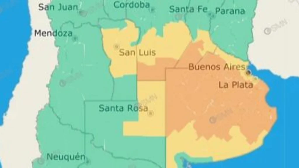 Buenos Aires: toda la franja central de la provincia se encuentra en alerta naranja, desde el límite con La Pampa hasta el océano Atlántico.