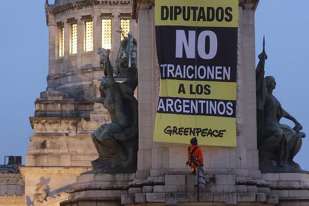 Son nueve activistas los que atravesaron las rejas de la plaza para treparse de la escultura. Dos de ellos se colgaron con un arnés e instalaron un cartel de Greenpeace que dice: “Diputados, no traicionen a los argentinos”.