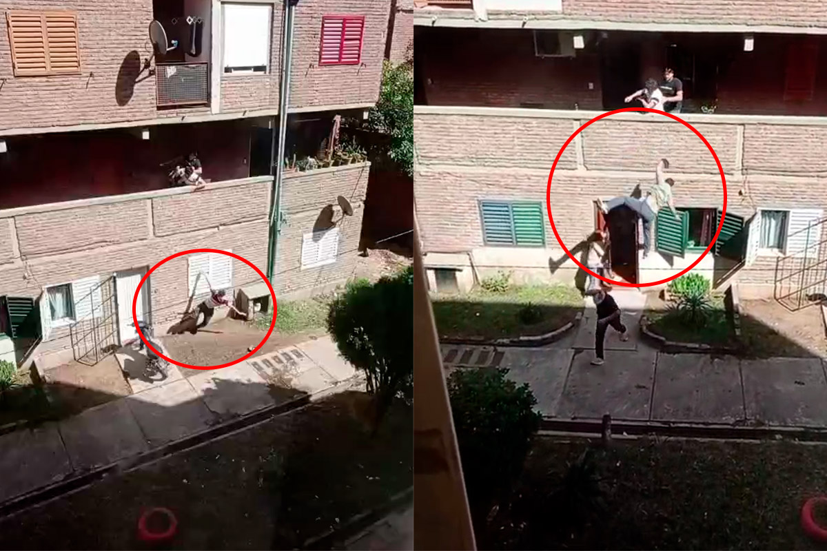 Lejos de que la situación se calmara, la riña continuó en el pasillo del edificio. En ese sector, se visualiza a otras personas involucradas en la pelea, incluyendo a un individuo que golpea a otro con un palo. El momento de mayor conmoción se produce instantes después: un sujeto vestido con remera blanca levanta a la persona que estaba siendo agredida y, sin mediar contemplaciones, la arroja por encima de la baranda hacia la planta baja.