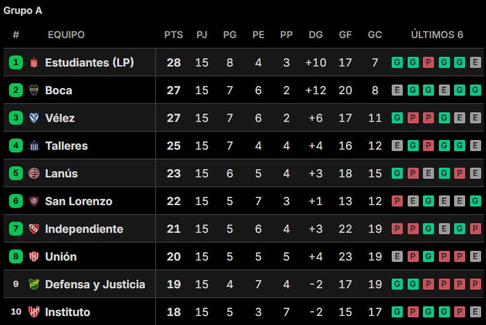 Quedan tres lugares en octavos para cinco clubes. Los que de momento se están quedando con los boletos son San Lorenzo (22 unidades tras superar a Platense de visitante 1 a 0); Independiente (21 luego de caer con Deportivo Riestra 2 a 0); y el Tatengue. El Halcón (19) e Instituto de Córdoba (18 después de empatar con Newell’s en Rosario 1 a 1) pujarán en la última jornada por quedar entre los ocho mejores.