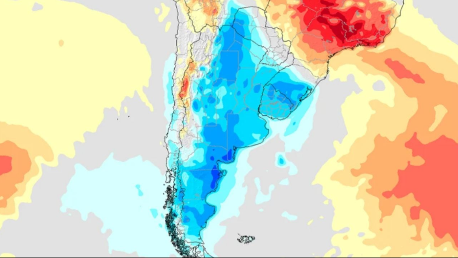 Desde el punto de vista de las precipitaciones, el escenario es claramente deficitario. El modelo indica anomalías negativas de lluvia en gran parte del centro y noroeste argentino, con acumulados semanales muy bajos o directamente nulos en varias provincias como Córdoba, La Pampa y el oeste de Buenos Aires.