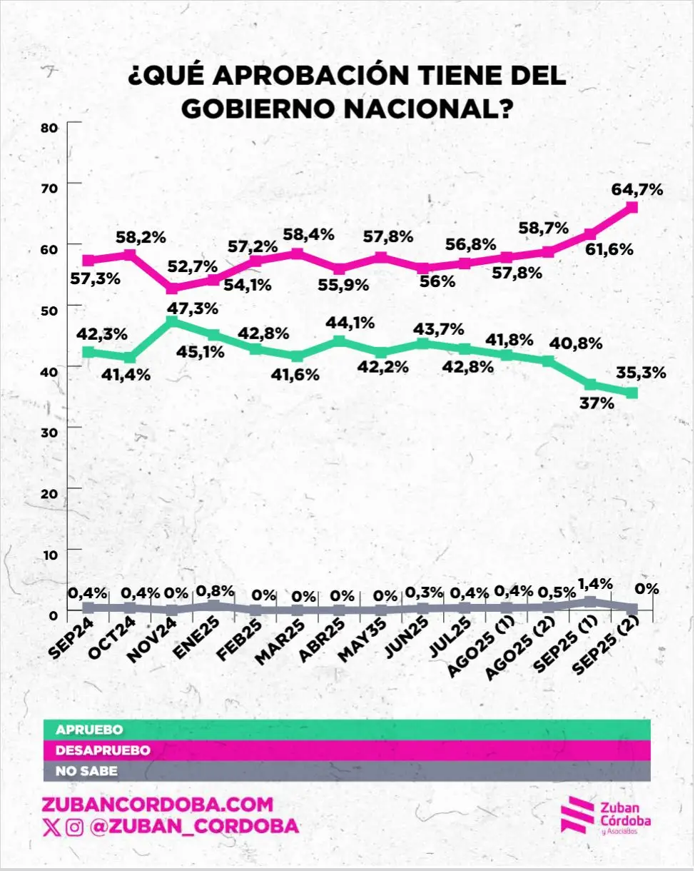 Los números de Zubán Córdoba se suman a los sondeos de Hugo Haime y Asociados, que registran una desaprobación de la gestión de gobierno del 60%; a los de Synopsis, que marca la desaprobación en un 58%; y a los de la Universidad de San Andrés, para quienes la desaprobación se ubica en el 59%.