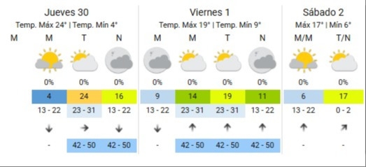 Para el inicio del fin de semana largo, el viernes 1 de mayo, el SMN indicó que la mínima va a ser de 9 grados, en tanto que la máxima se va a ubicar en los 19 grados. Todo el día las nubes van a estar en un ir y venir, un cielo parcialmente cubierto, pero la cosa va a ser solo parcial y de a ratos podría despejarse. Un día ideal para descansar o hacer actividades al aire libre o disfrutar con amigos, con mates y familia. ¿El viento? Insiste. Todo el día se va a hacer sentir con sus ráfagas de hasta 50 km/h y viento sur que va a traer un poco más de frío.