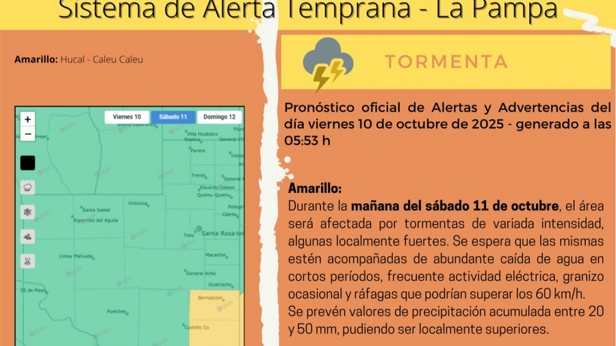 Por su parte, el alerta amarillo por tormentas fuertes abarca a los departamentos Caleu Caleu y Hucal.
