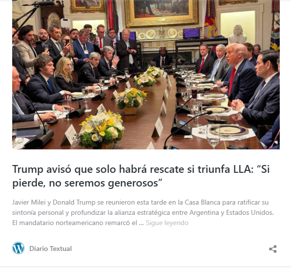 La expresidenta Cristina Fernández de Kirchner se volcó a sus redes sociales esta tarde para destacar que el mandatario estadounidense, Donald Trump, haya condicionado la ayuda a la Argentina al resultado de las elecciones, durante el almuerzo que mantuvieron ambas comitivas en la Casa Blanca. “Trump a Milei en Estados Unidos: ‘Nuestros acuerdos están sujetos a quien gane las elecciones’. ¡Argentinos… ya saben lo que hay que hacer!”, escribió la exmandatario en la red social X.