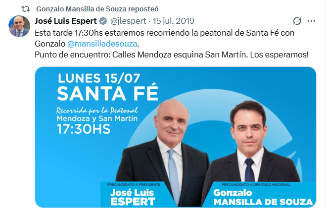 No es el único dirigente del partido de Alsogaray que aparece en la nómina. El rosarino Gonzalo Mansilla de Souza fue candidato de Espert en Santa Fe y el 15 de julio de 2019 viajó desde San Fernando en un avión de Machado. Ese día Espert y Mansilla participaron de una caminata de campaña por la peatonal de la capital provincial que arrancó en la esquina de Mendoza y San Martín.