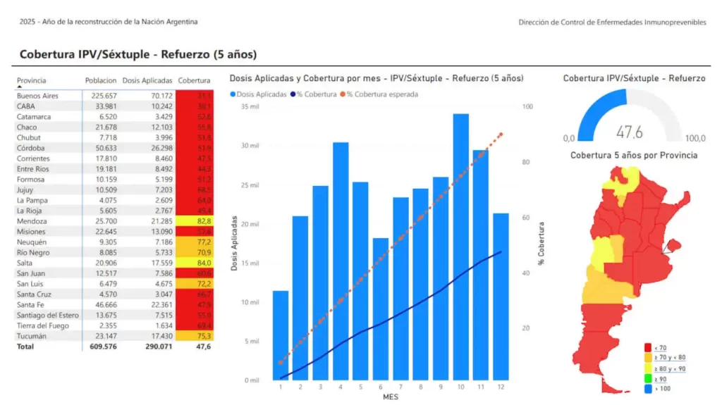 Por último, la vacuna IPV/Séxtuple (refuerzo 5 años), que previene difteria, tétanos, tos convulsa (o coqueluche), Haemophilus influenzae tipo b (Hib), hepatitis B y poliomielitis, en La Pampa se aplicó a 2609 niños y niñas de una población objetivo de 4075.