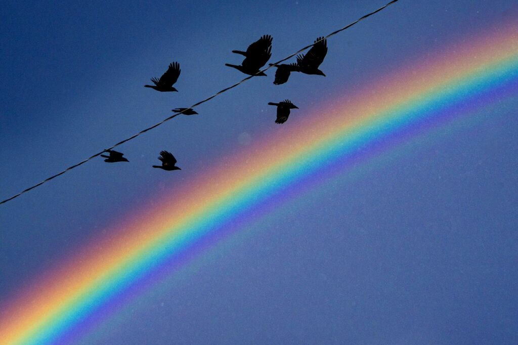 Placentia, EE.UU.- Una bandada de cuervos surca el cielo delante de un arcoíris. Es singular poder fotografiar el arcoíris en pleno esplendor. Y más lo es captar el instante en que un grupo de aves se atraviesa entre la mirada y este fenómeno óptico. A su vez, esta coincidencia no es lo único destacable aquí. Es posible ver cómo se proyectan sobre el firmamento dos símbolos de significados culturales diametralmente opuestos: los cuervos, asociados a lo largo de la historia con los malos presagios, con la muerte, por tratarse de aves carroñeras. Y el arcoíris, que representa la esperanza, la alianza entre cielo y tierra, la existencia de un futuro promisorio, opuesto al futuro incierto o inexistente que se asocia a la presencia funesta de esas aves oscuras. Sí, la lectura de esta imagen está cargada de subjetividad. Sin embargo, el futuro de todos se debate hoy mismo entre ambas interpretaciones, más allá de toda duda.