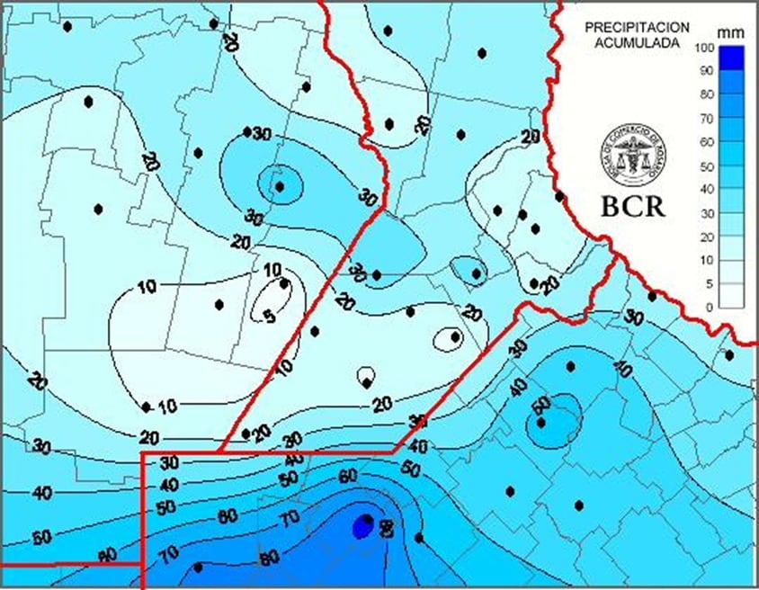 Entre el viernes a las 8 y hoy a las 8, los registros mostraron volúmenes significativos: General Villegas, 82 mm; General Pinto, 94 mm; Monte Buey, 48 mm; Godeken, 36 mm; Rojas, 55 mm; y Pergamino, 47,6 mm. A eso se sumaron focos aún más intensos, como los más de 135 mm en Rafaela, según relevamientos de la Bolsa de Comercio de Rosario (BCR).