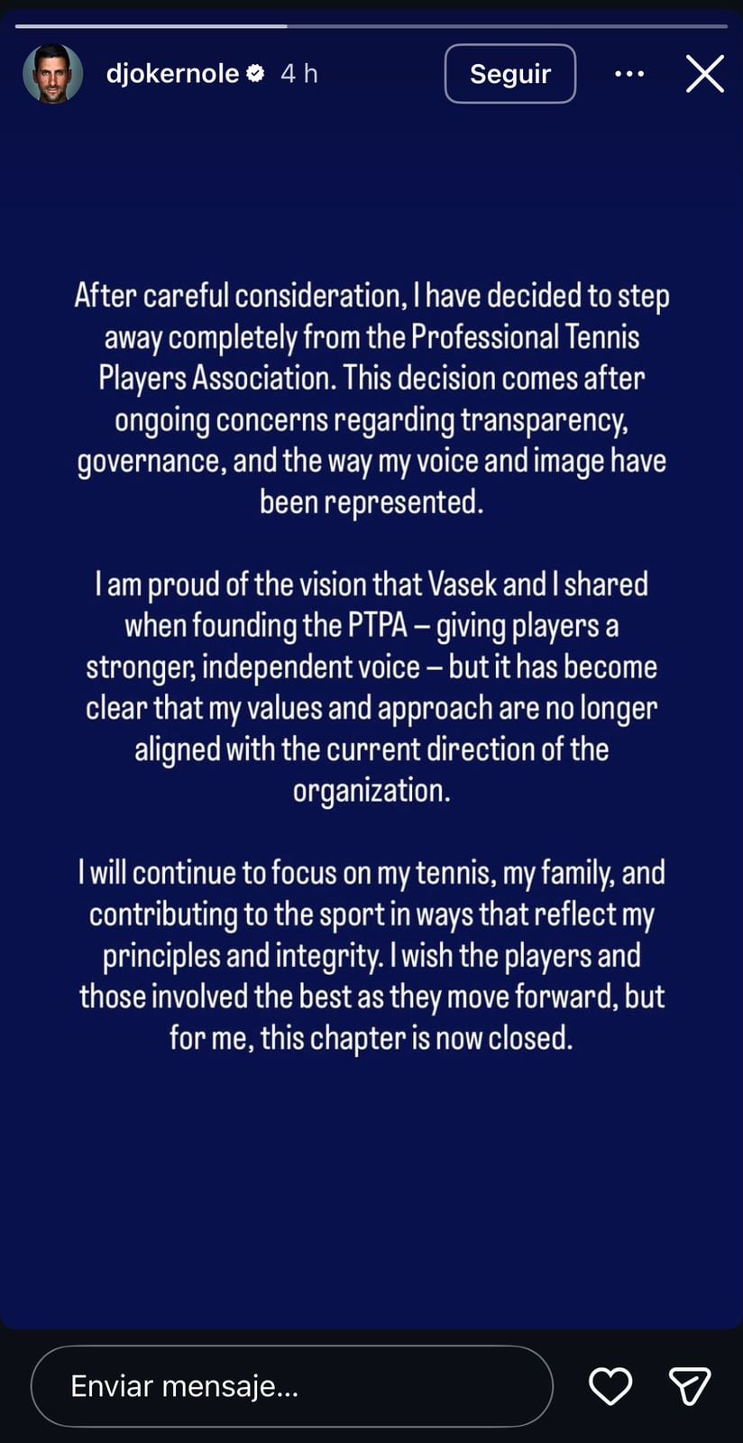 Novak Djokovic decidió renunciar a La Asociación de Jugadores Porfsionales de Tenis (PTPA), la cual reúne a los 500 mejores del mundo a nivel ATP y WTA. Fue fundada por el serbio y Vasek Pospisil en 2021.El ex número uno, emitió un comunicado en sus redes sociales y se retiró del sindicato. El comunicado“Tras considerarlo detenidamente, he decidido retirarme por completo de la Asociación de Tenistas Profesionales. Esta decisión surge tras las persistentes preocupaciones sobre la trasparencia, la gobernanza y la forma en que se han representado mi voz e imagen”, expresó.“Estoy orgulloso de la visión que Vasek y yo compartimos al fundar la PTPA (dar a los jugadores una voz más fuerte e independiente),pero ha quedado claro que mi valores y mi enfoque ya no están alineados con la dirección actual de la organización”, siguió.“Seguiré centrándome en mi tenis, mi familia y contribuyendo al deporte de maneras que reflejen mis principios e integridad. Les deseo a los jugadores y a todos los involucrados lo mejor en su futuro, pero para mí, este capítulo ya está cerrado”, finalizó. La Voz