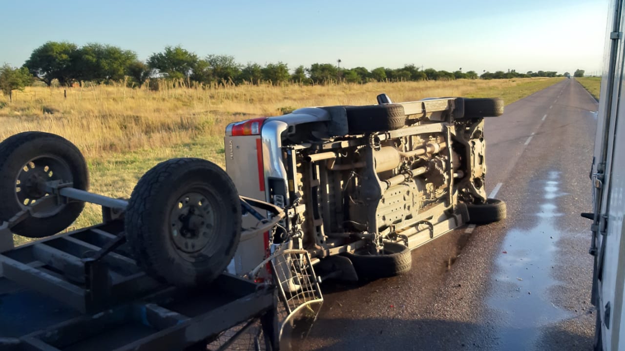 El vehículo, en el que se desplazaban dos ocupantes oriundos de la ciudad de General Pico, circulaba en el tramo comprendido entre las localidades de Metileo y Monte Nievas. Por motivos que aún son materia de investigación, el conductor perdió el control de la unidad, lo que provocó el vuelco tanto de la camioneta como del carro que transportaba la carga.