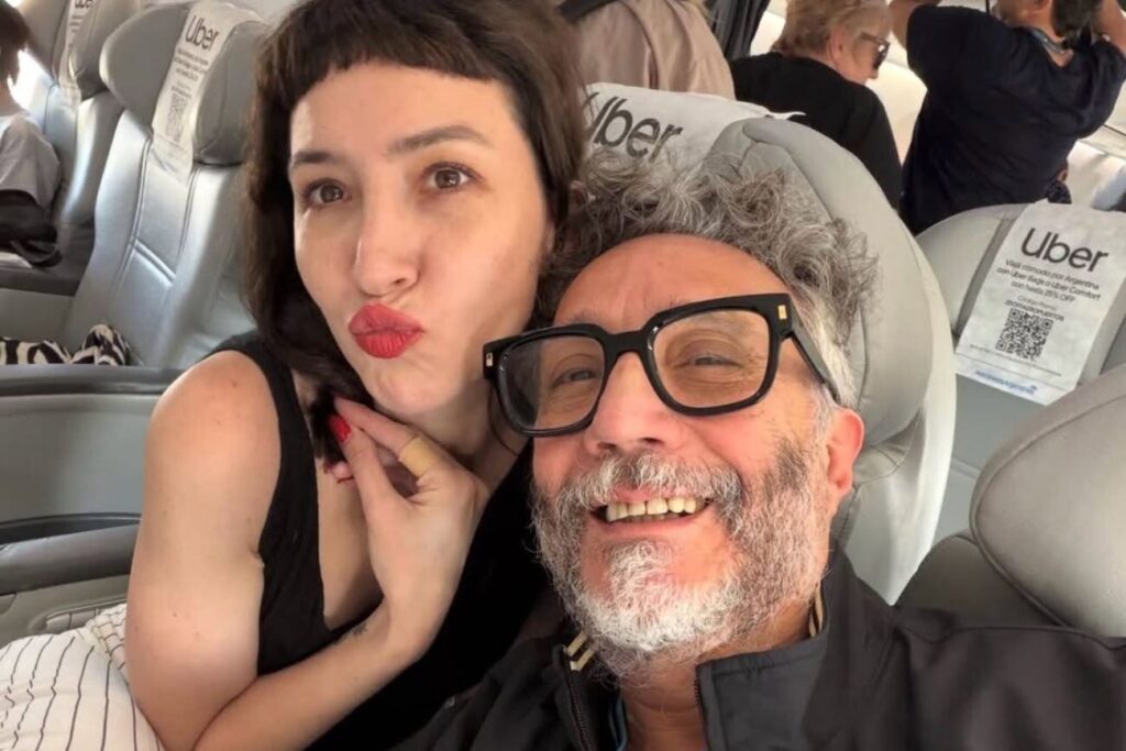 Fito Páez usó su cuenta de Instagram para compartir una foto de ambos, tomada en un viaje en avión. En la imagen, Sofía Gala aparece lanzando un beso con los labios pintados de rojo, mientras el cantante sonríe y sostiene el teléfono para la selfie.