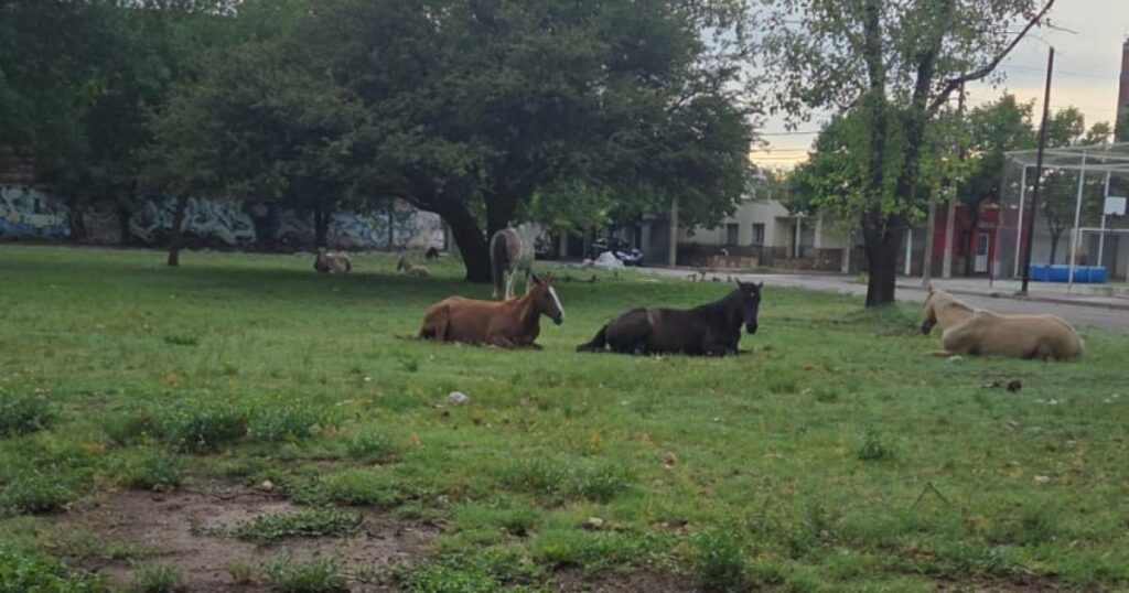 La presencia de equinos fue registrada en un espacio verde de la zona de 9 de Julio y El Fortín, pese a la vigencia de una ordenanza que prohíbe animales no domésticos sueltos en la vía pública y establece su secuestro.